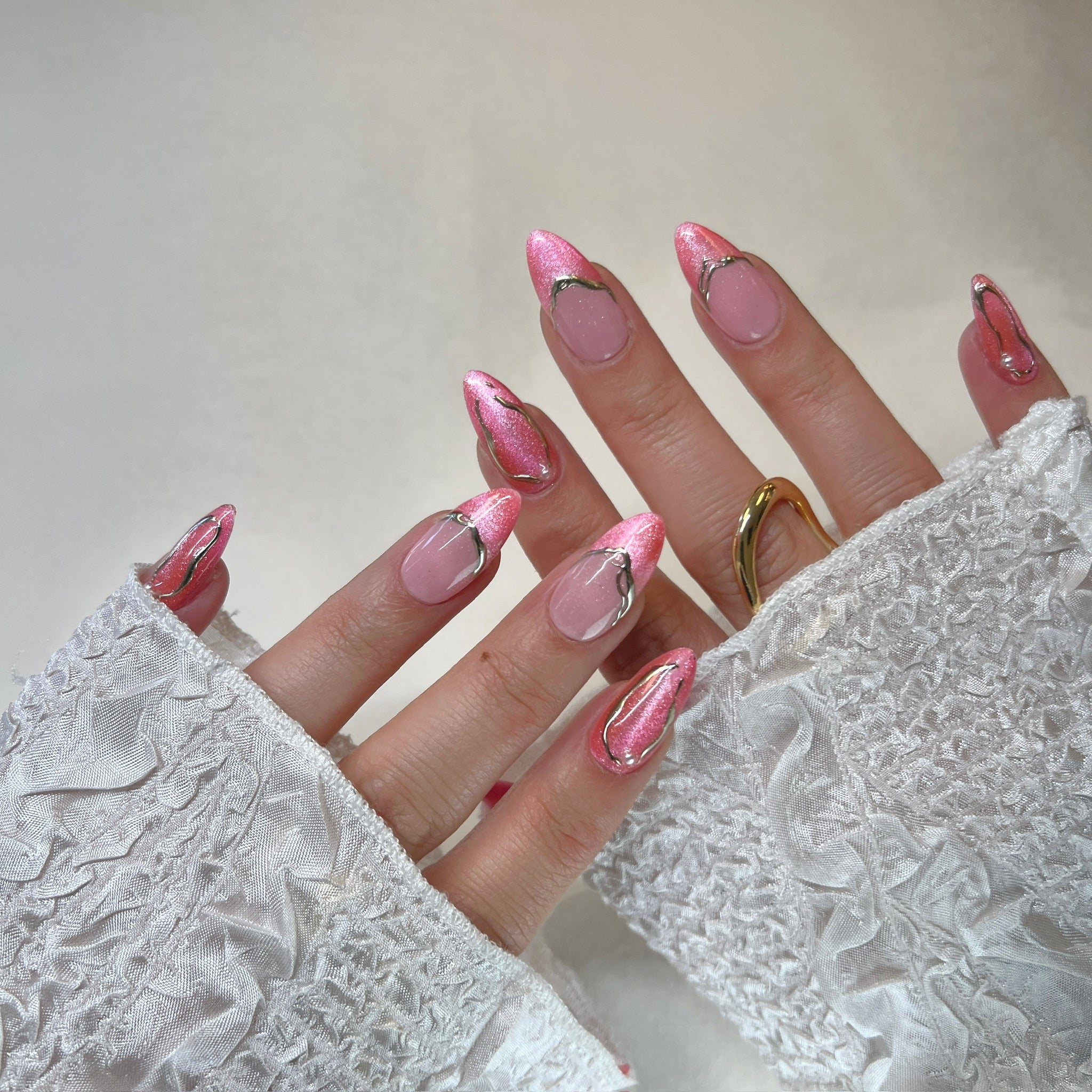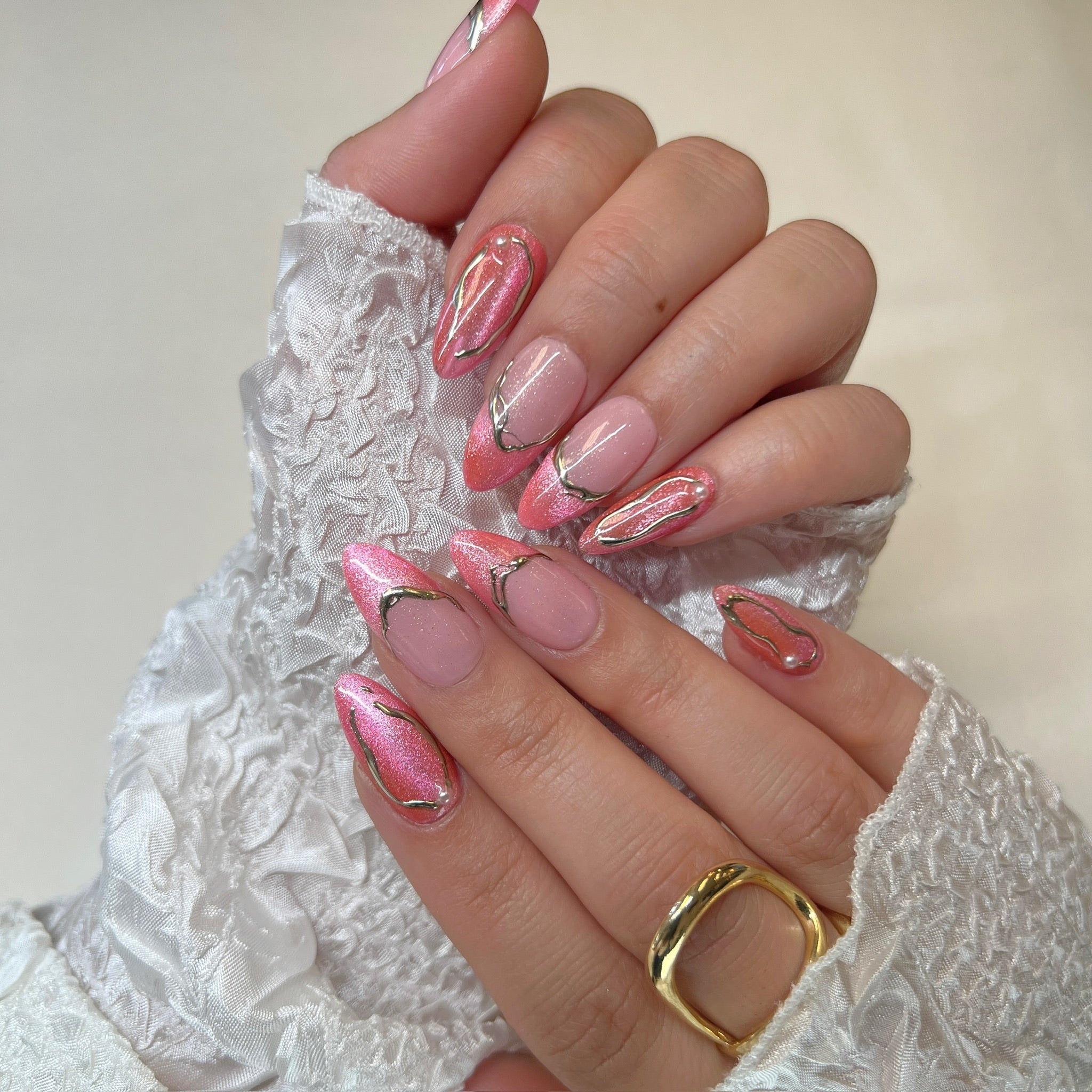 Details:A delicate mix of glossy blush tones, shimmering pink chrome, and flowing gold accents that bloom beautifully across each nail.