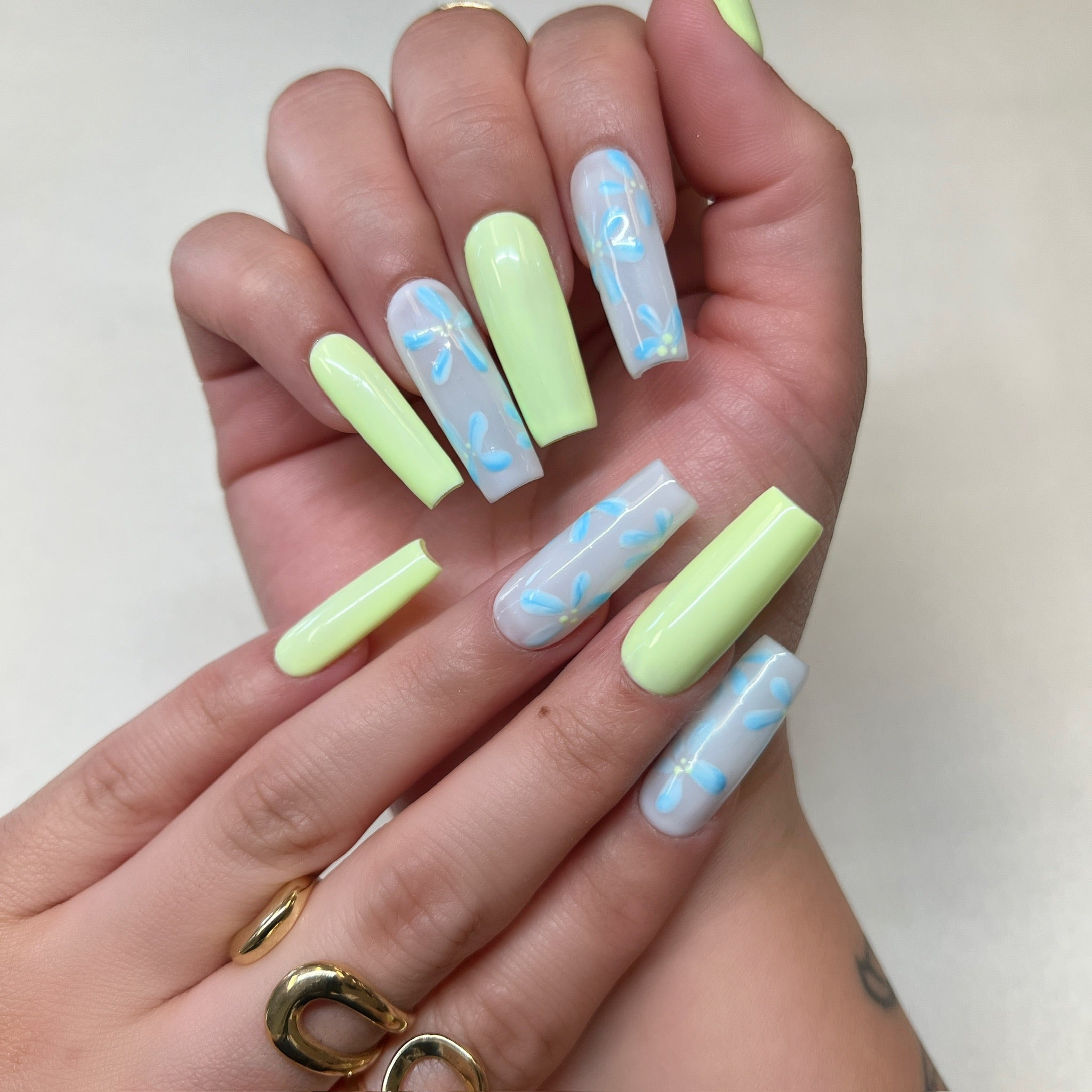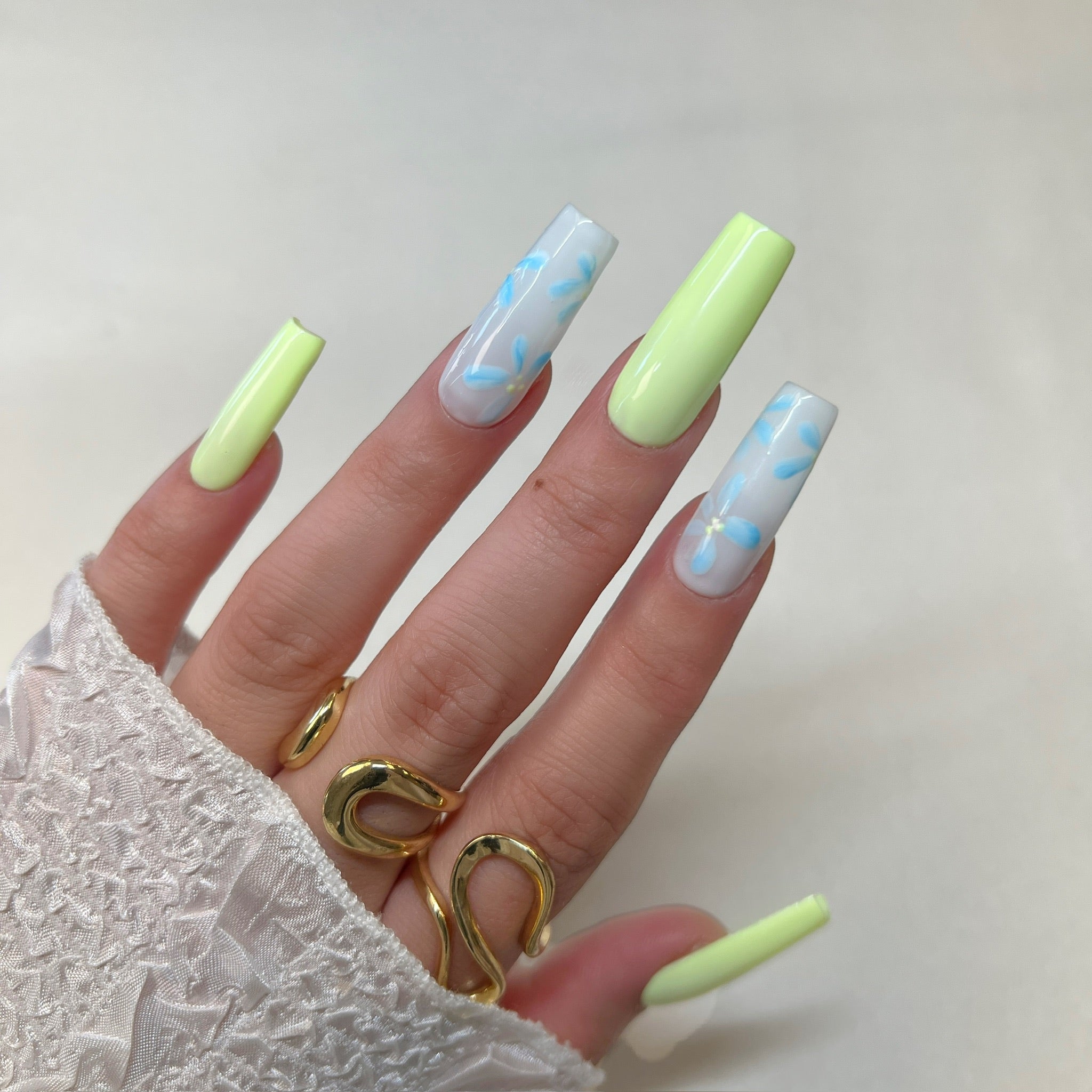 Details: the perfect mix of soft florals and playful color—featuring glossy lime green nails paired with dreamy baby blue daisy designs on a milky base.