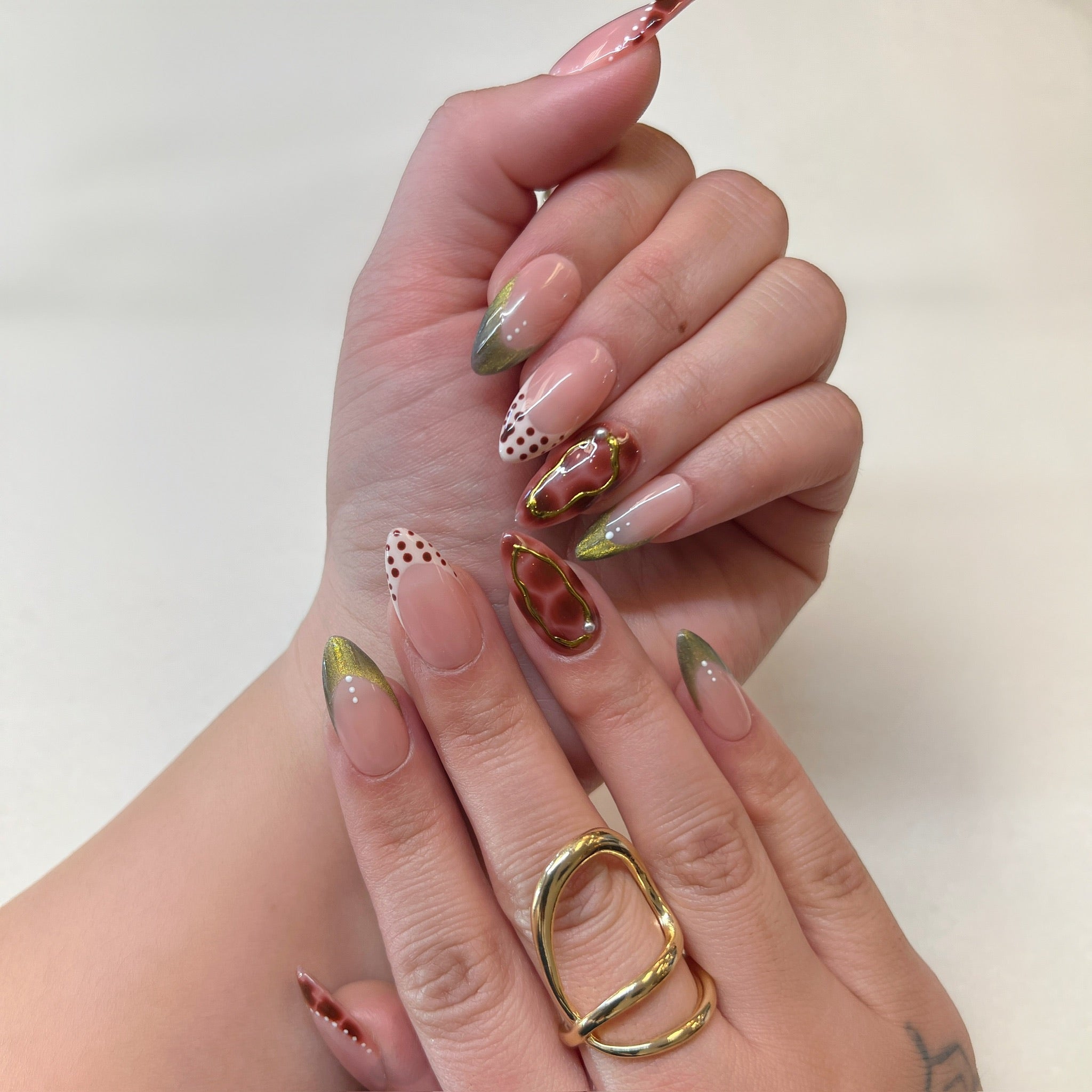 A luxe blend of glossy nude tones, deep mocha accents, and shimmering gold tips that melt together for the ultimate elevated look.