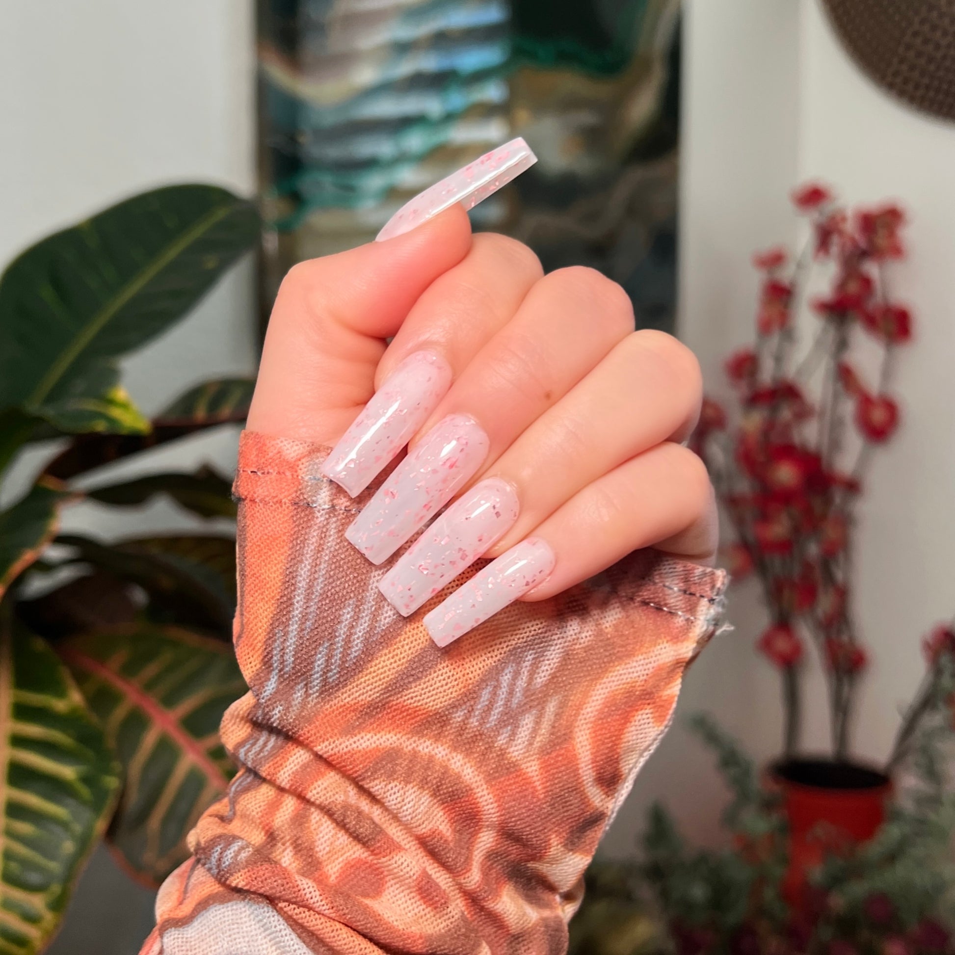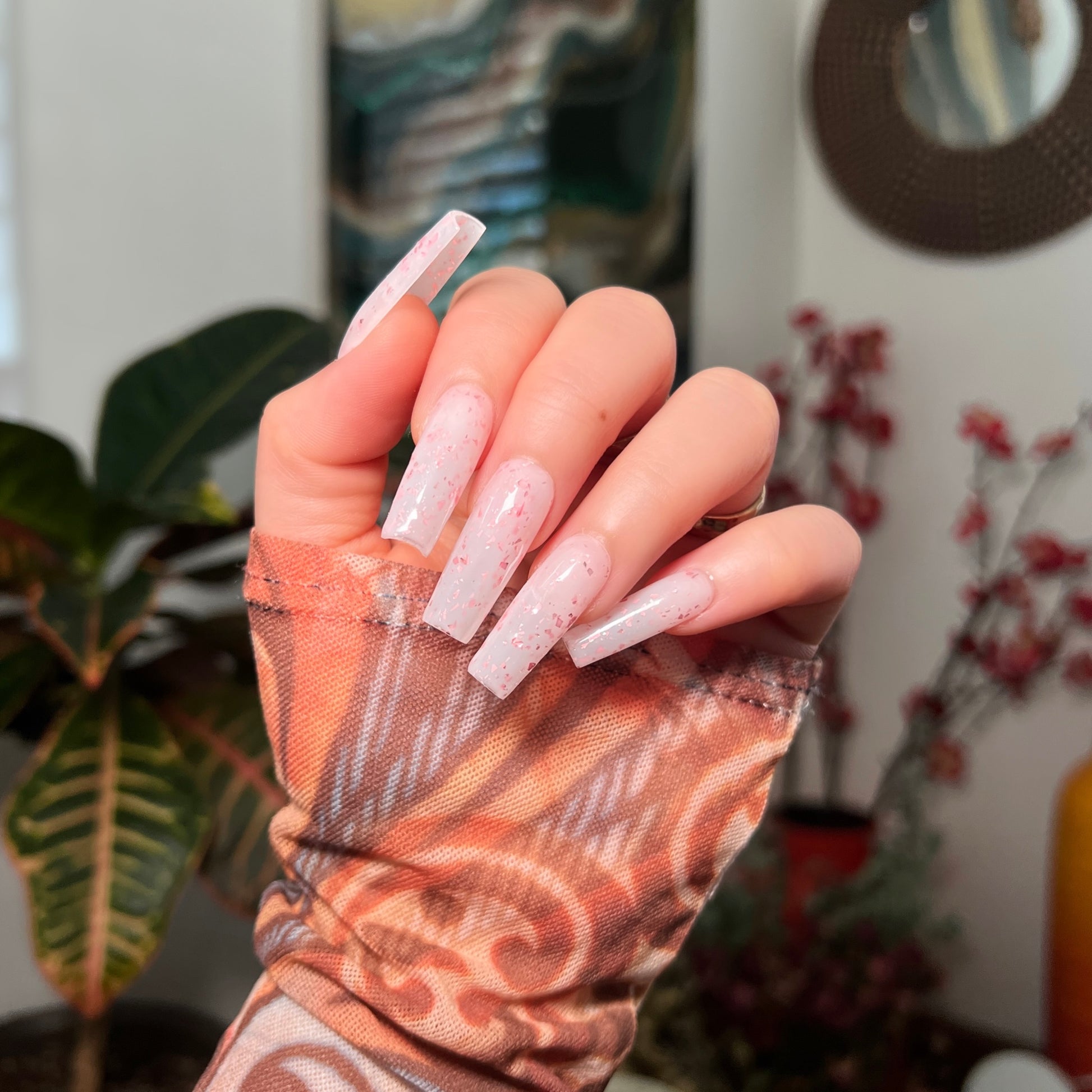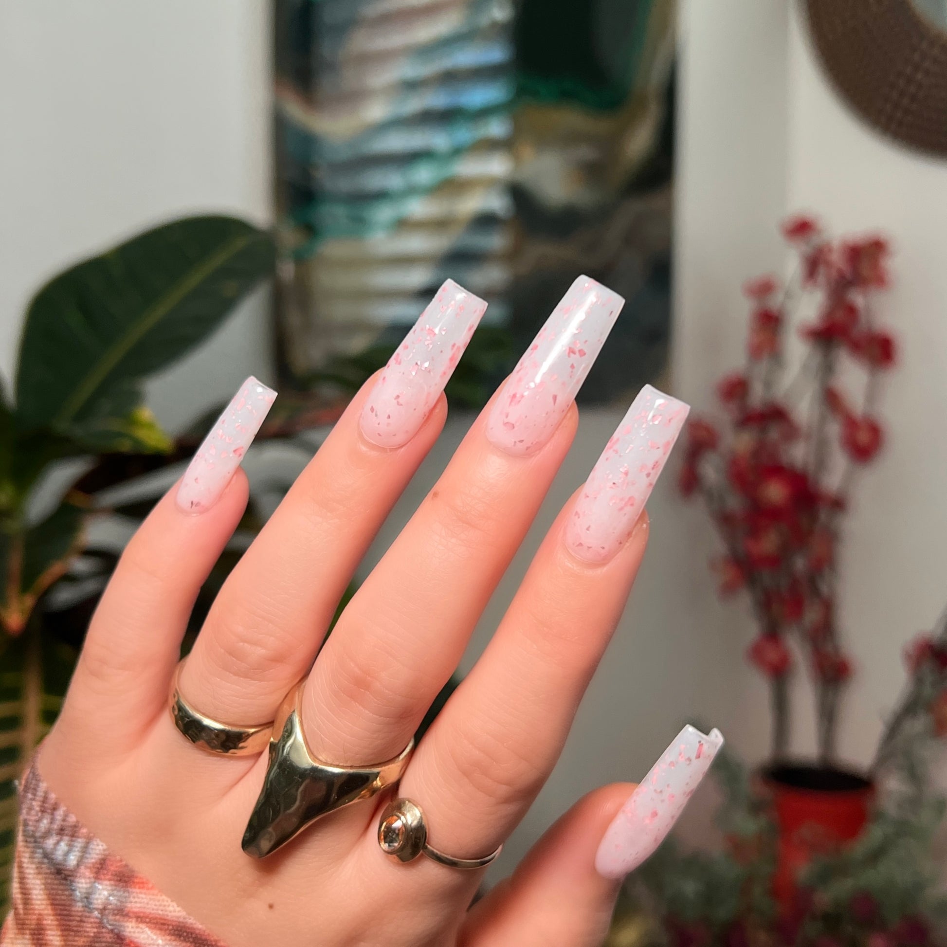 Creamy sheer with a hint of pink flakes mixed inside the polish giving it a creamy milk tea look.