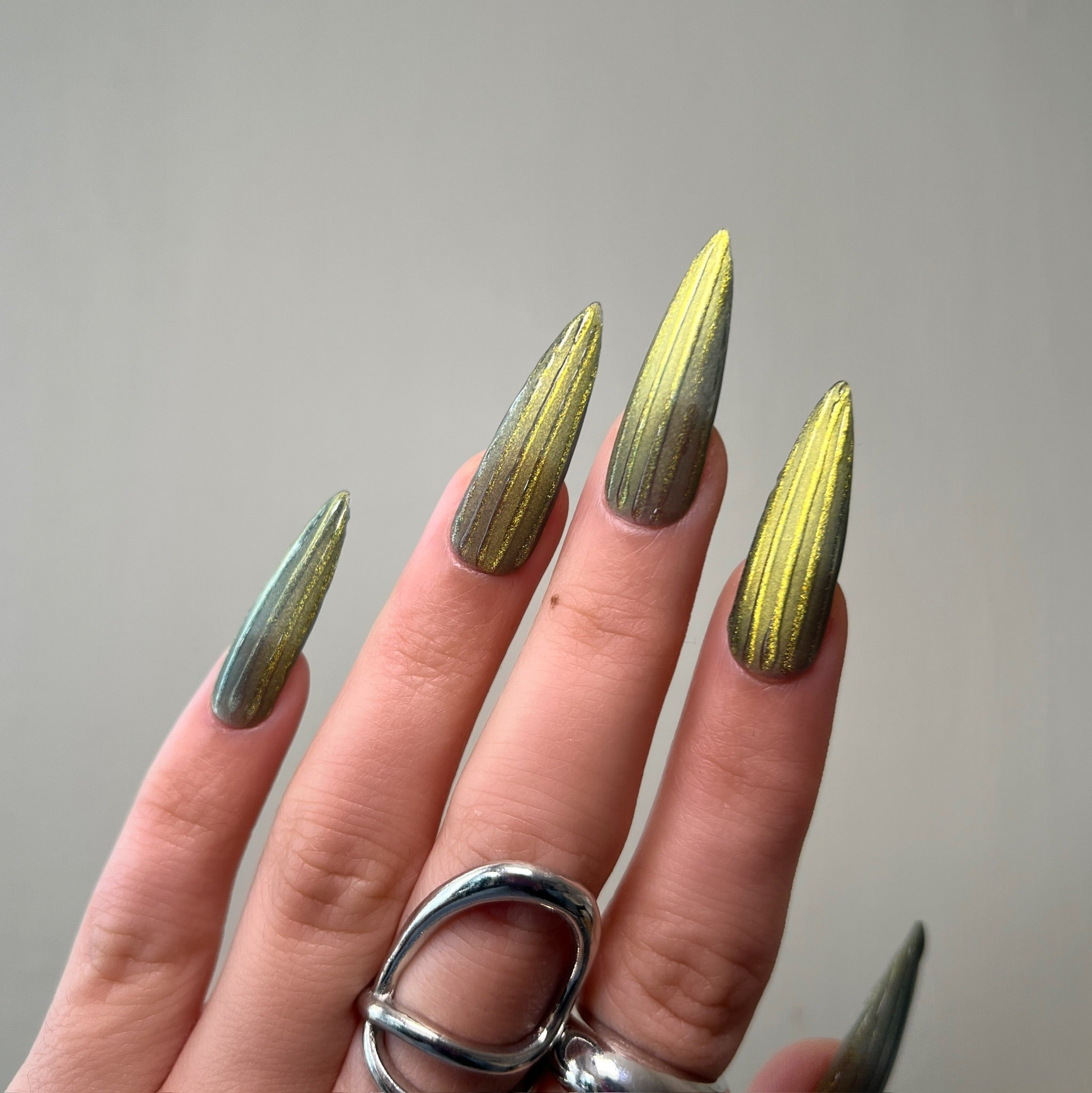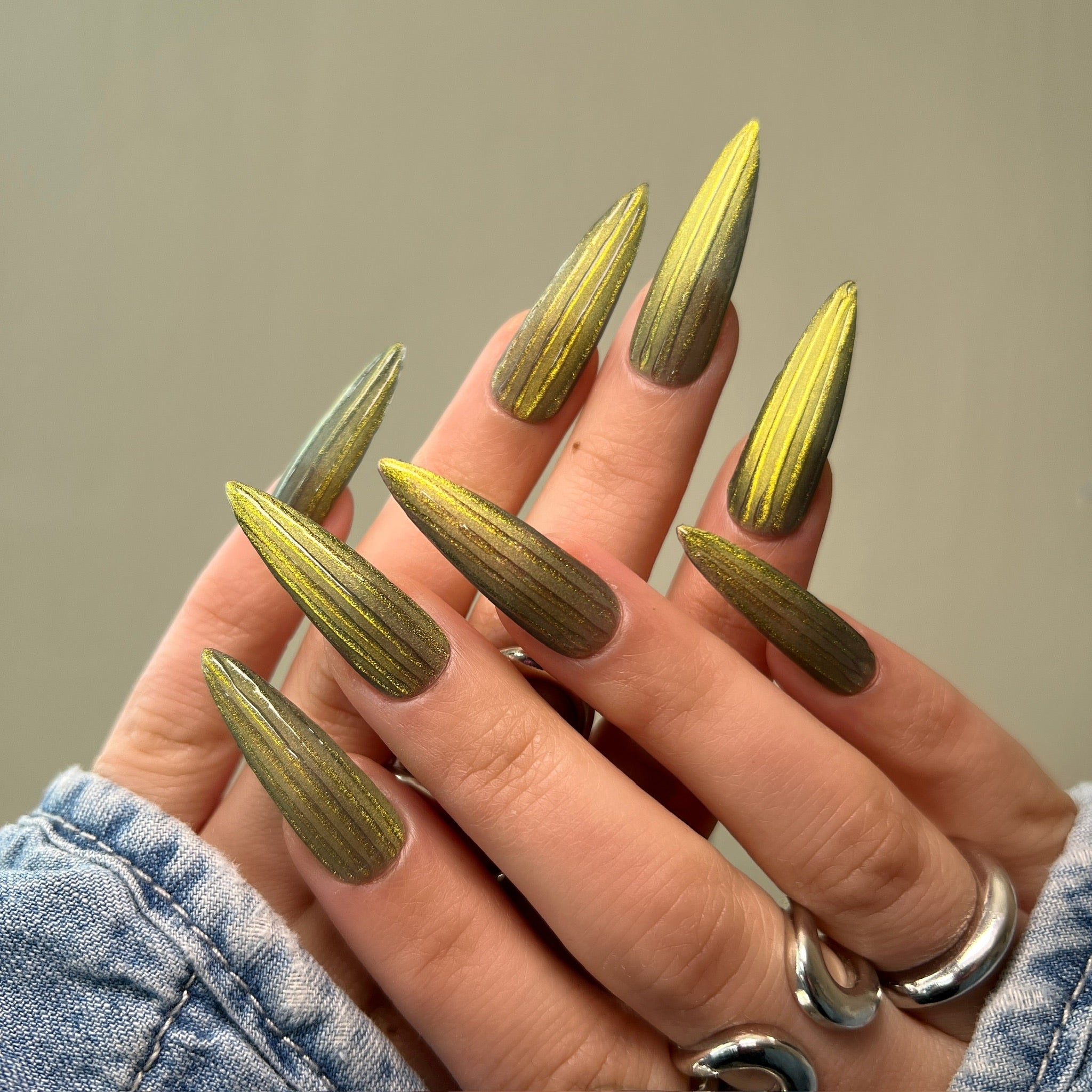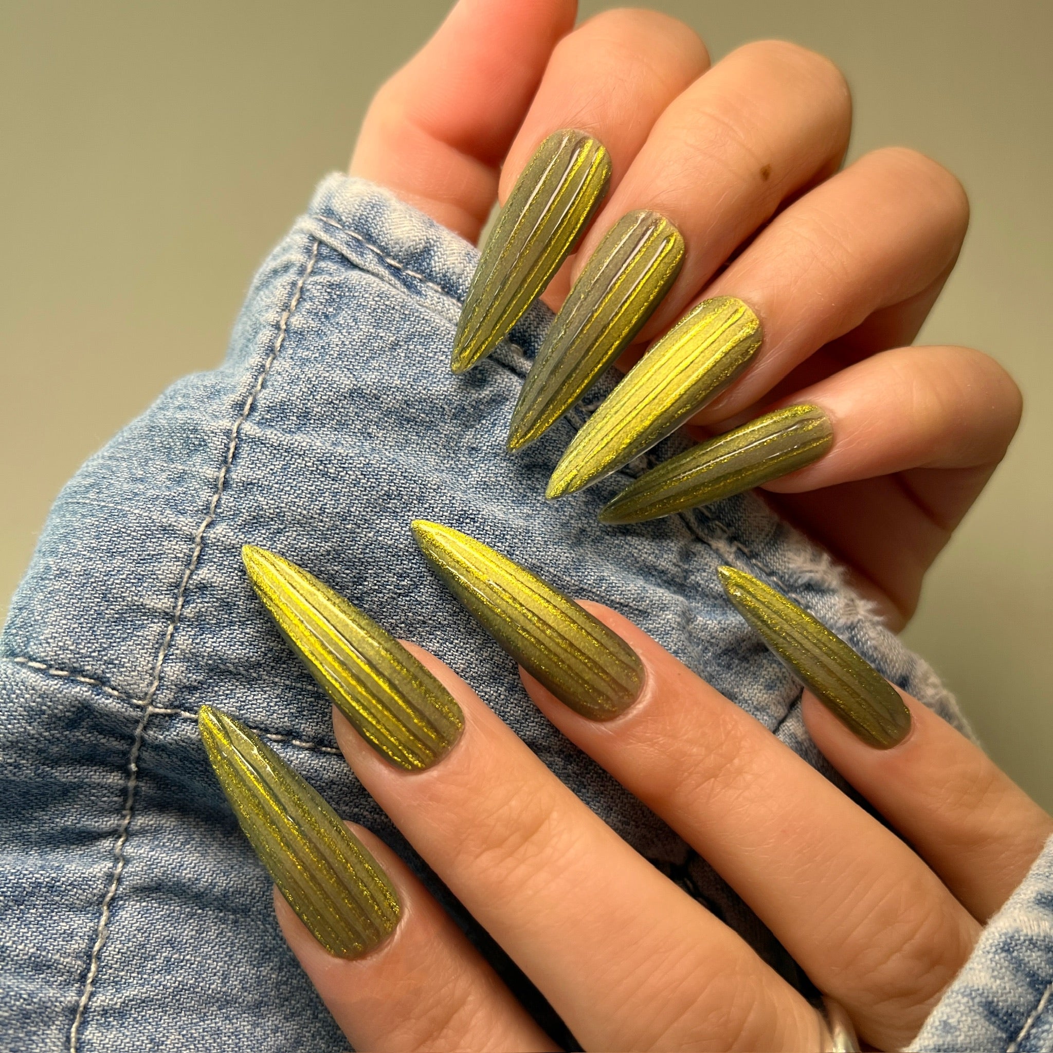 Details: Earthy olive tones infused with molten gold shimmer. Bold, radiant, and effortlessly luxe.