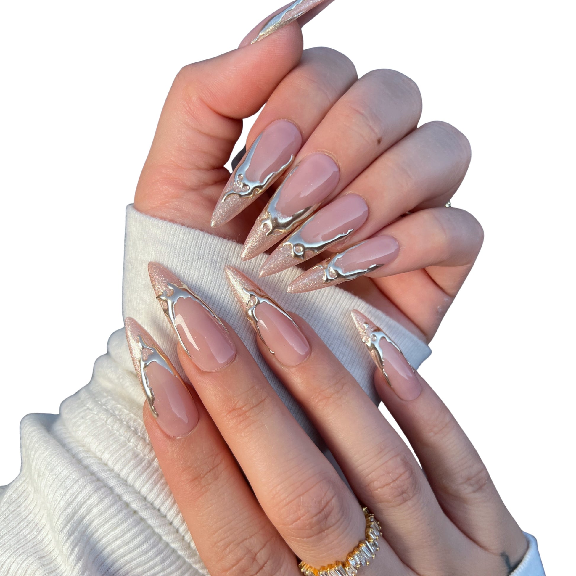 Details; Gold Chrome, Black French tip accents, white marble, 3D gold chrome textures, Sandy Glitter, Gold beads & Gold crystals decal