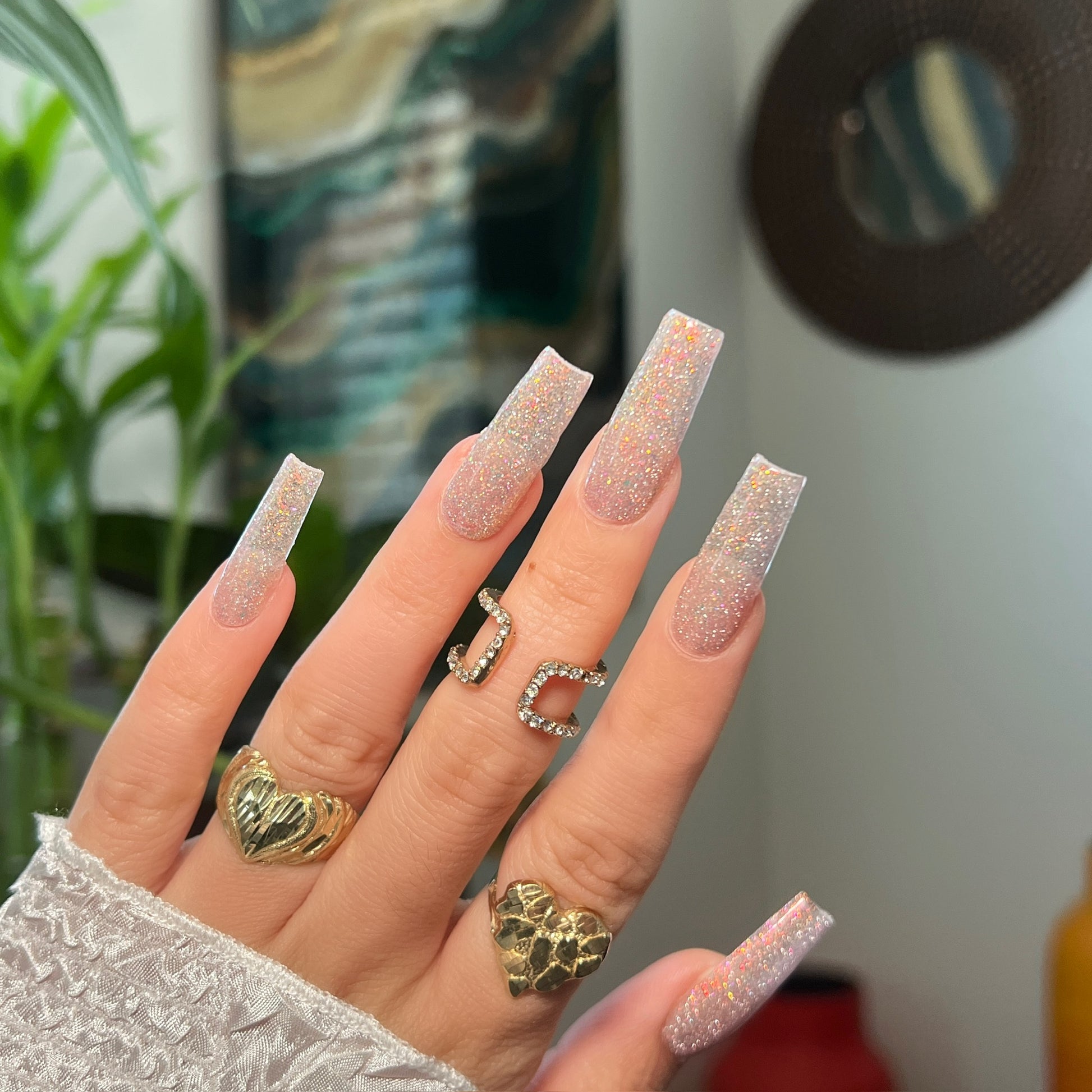 Sandy Glittery ombre tips with a dash of gold crystals.